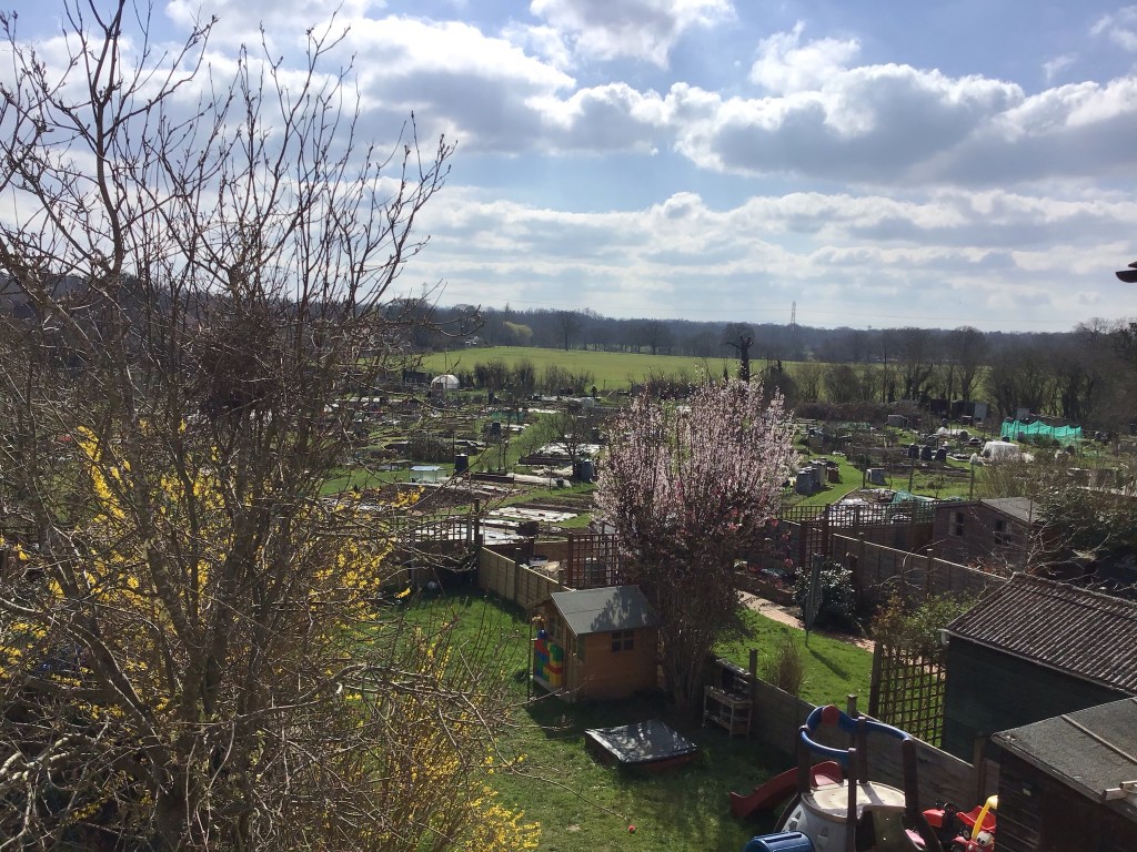 At the end of it all – job very very well done including the heroic tip trip by Mr Mackie where he had to sit in a queue for some hours or was it days- this is the view from the temporary office – next doors gardens and the allotments and then the fields…..ahhhhhhhhhhh